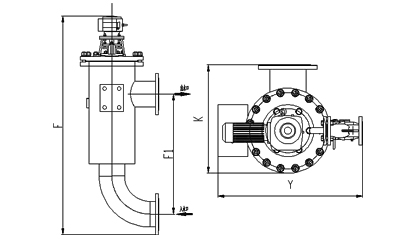 型號 管徑 出入水口 F Y K 濾網面積 處理水量 重量